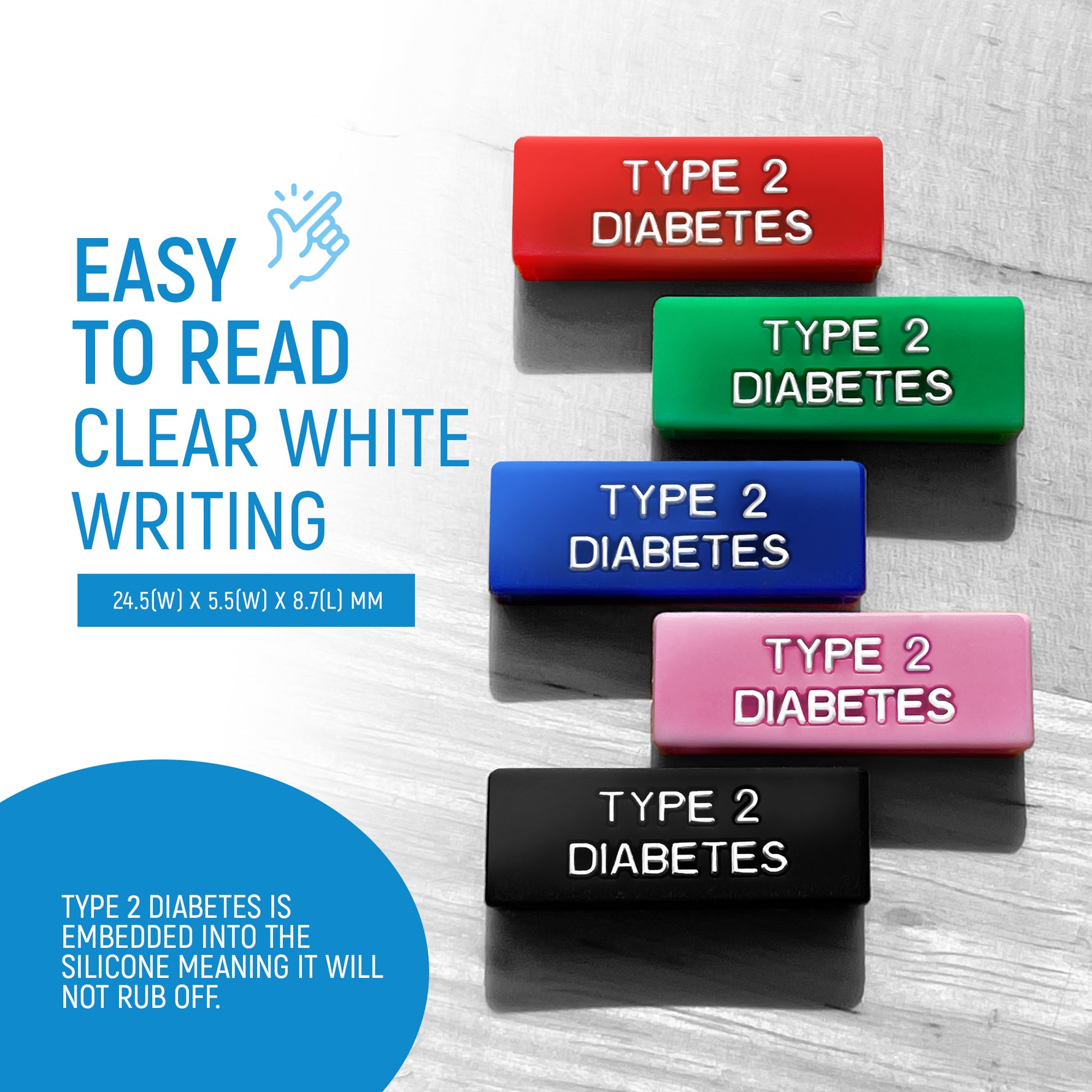 These silicone wrist sleeves are designed to be comfortable to wear. The “Type 2 Diabetes” text won’t rub off or twist on the band.