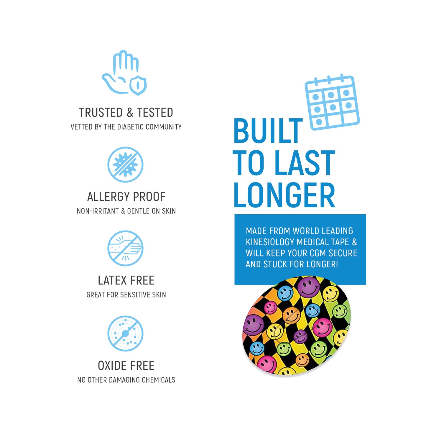 Available for any CGM or pump site on the market. Our NEW mini option is great for those that want less adhesive, measuring 95mm x 50mm they offer protection for the sensor and some colour!